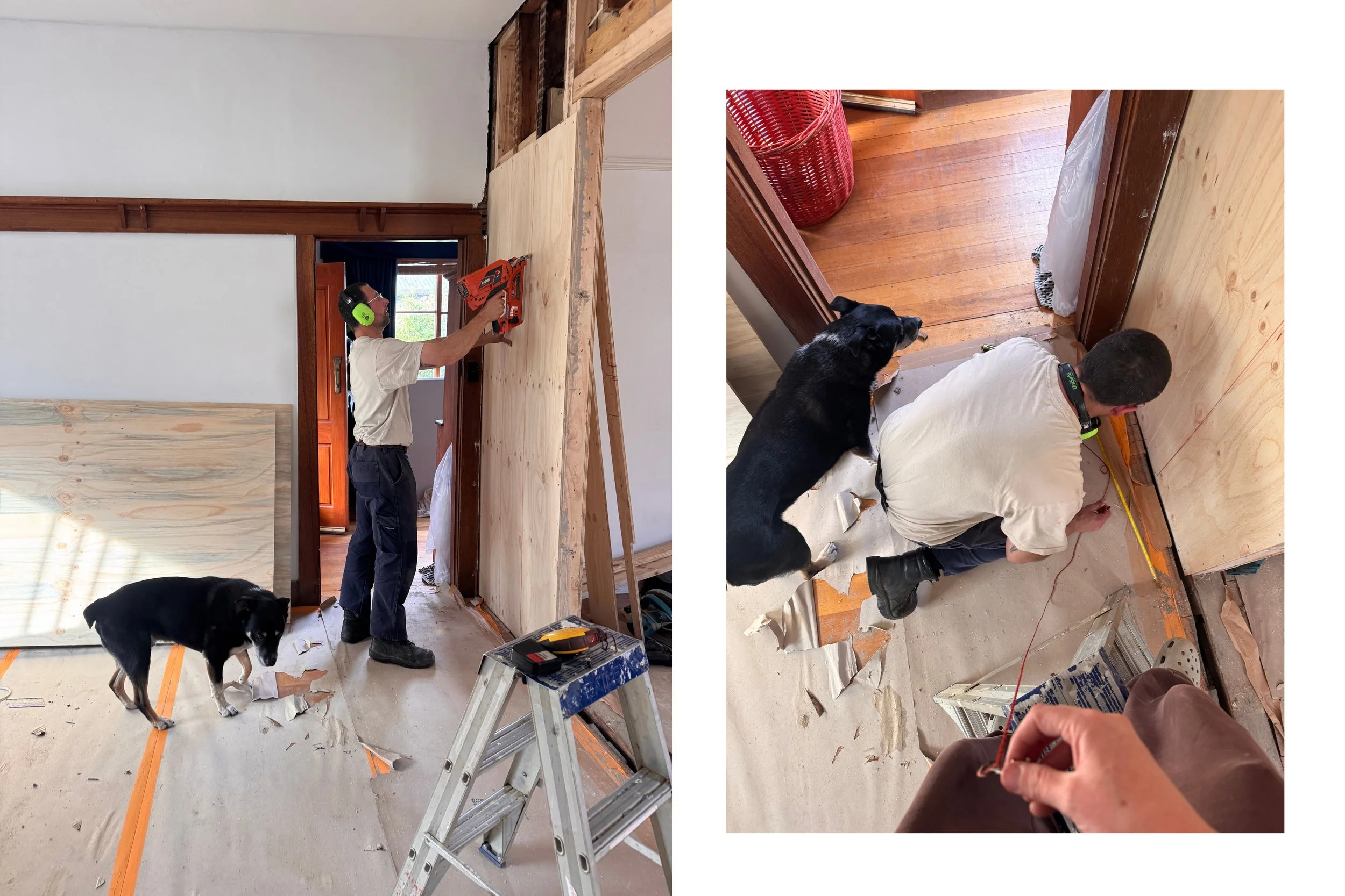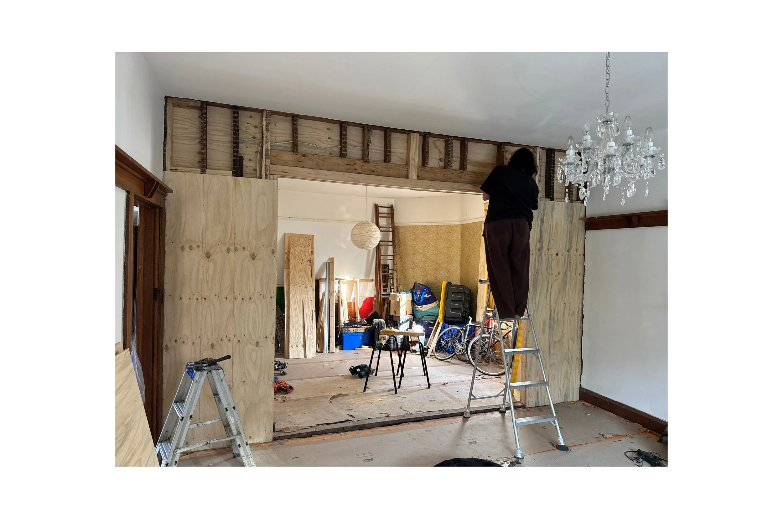 It was a surreal moment & it reminded me of being in a movie or something. We’d spent the past few weeks with the help of my dad, removing the lath and plaster from the wall, installing lots of new studs, a big new lintel and adding structural ply. At this point all that was left was to cut the opening through.