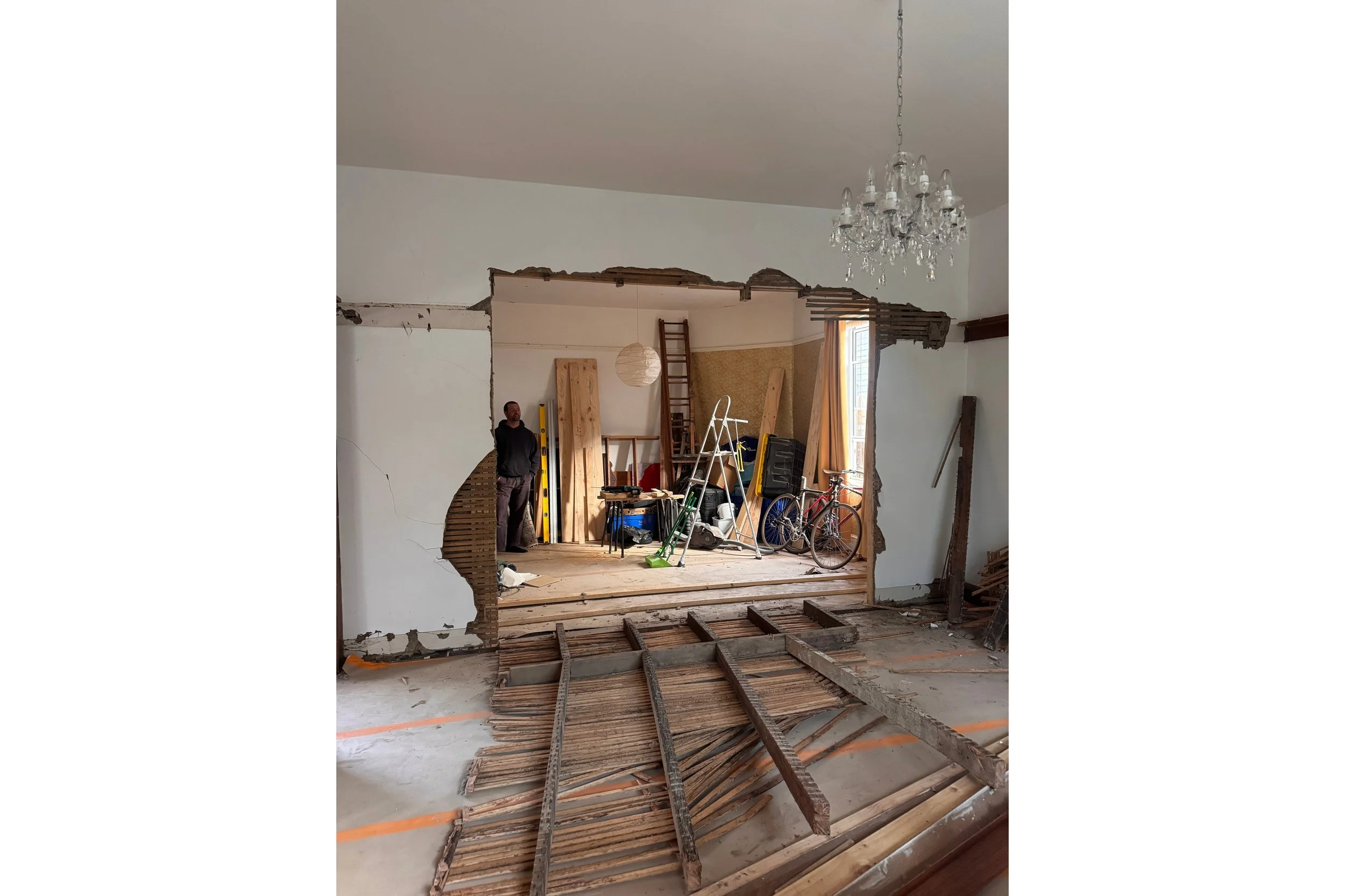 The dimensions of this wall opening were discussed a lot. How tall will the opening be? How will the opening relate to the 1930s and the 1920s picture rails, given that both rails are at different heights? How will the opening relate to our equipment and machines that we’ve ordered? Will we get enough light? Will we get a sense of flow?
